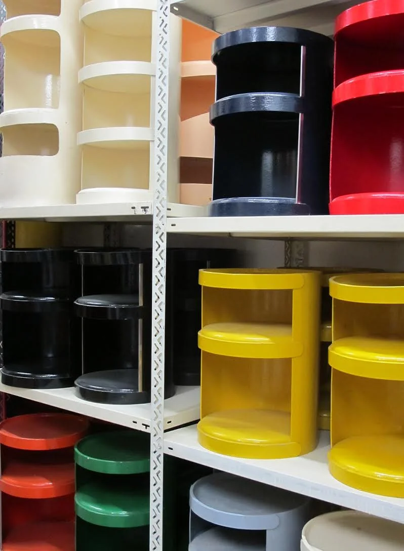 Container Furniture—which included several pieces for children—ranged widely in scale and function, but a cutout, curvilinear form language and lacquered Celloderme materiality unites all of the work. A signature piece from the collection is the Standard chair. This playful take on a barrel chair is designed in adult proportions but possesses a childlike quality. Featuring playful colors, oblong cutouts, and a sleek wrapping back, the Standard chair is a great expression of the material’s design potential. It emphasizes the lightweight, sculptural yet structural quality that Celloderme lends itself to so well.