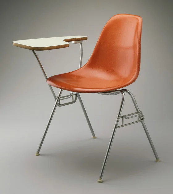 In partnership with the University of California–Los Angeles department of engineering, the Eameses devised a stamped-steel seat that could be configured with multiple base options for a 1948 competition at the Museum of Modern Art. The International Competition for Low-Cost Furniture Design sought revolutionary manufacturing processes and ingenious models to meet the needs of growing families after the Second World War. The competition guidelines required that designs be adaptable for a variety of uses; the chair won second prize. The molded-steel design, however, was expensive to manufacture, making the chair too costly for young parents. Accessibility being one of the Eameses’ key design tenets, Charles and Ray collaborated with UCLA, Herman Miller Inc., and plastics manufacturer Zenith to refine their model. The end result was a molded polyester seat reinforced with glass fibers—more commonly known as fiberglass—created for the newly formed Plastic Shell Group in 1950.