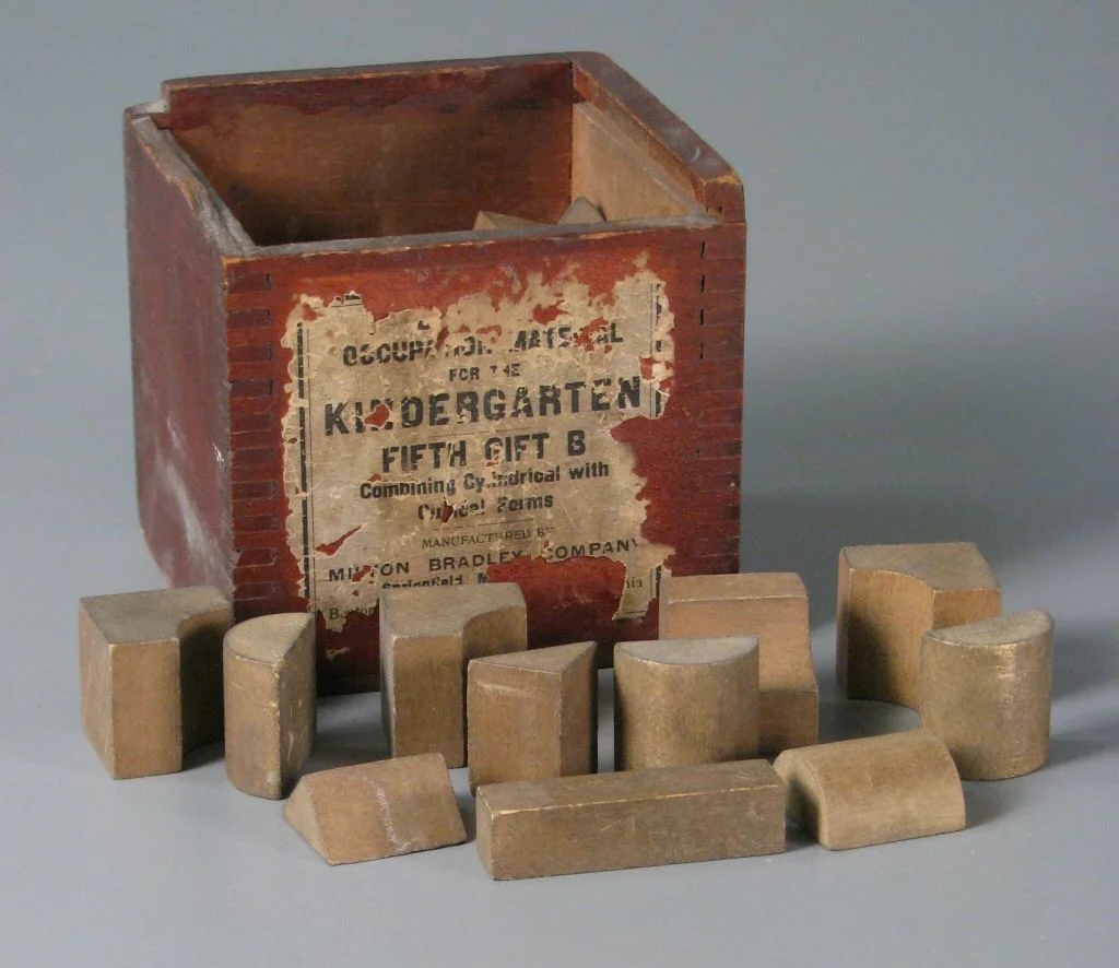 The block first appeared in modern classrooms in the mid-1840s, when German educator Friedrich Froebel formulated the concept of kindergarten through his work at the Play and Activity Institute, which he founded in 1837. He developed what he called “Froebel gifts,” a series of objects that children would receive at fixed stages of their development, ultimately collecting a complete set. Among the gifts were blocks: a single cube, followed by a cube composed of smaller, iterative cubes. The next gift explored the cube further, breaking it down into halves and quarters. Froebel gifts introduced ideas about geometry, spatial relationships, friction, and balance, as well as basic architectural building concepts, which helped their recipients understand the world around them.
