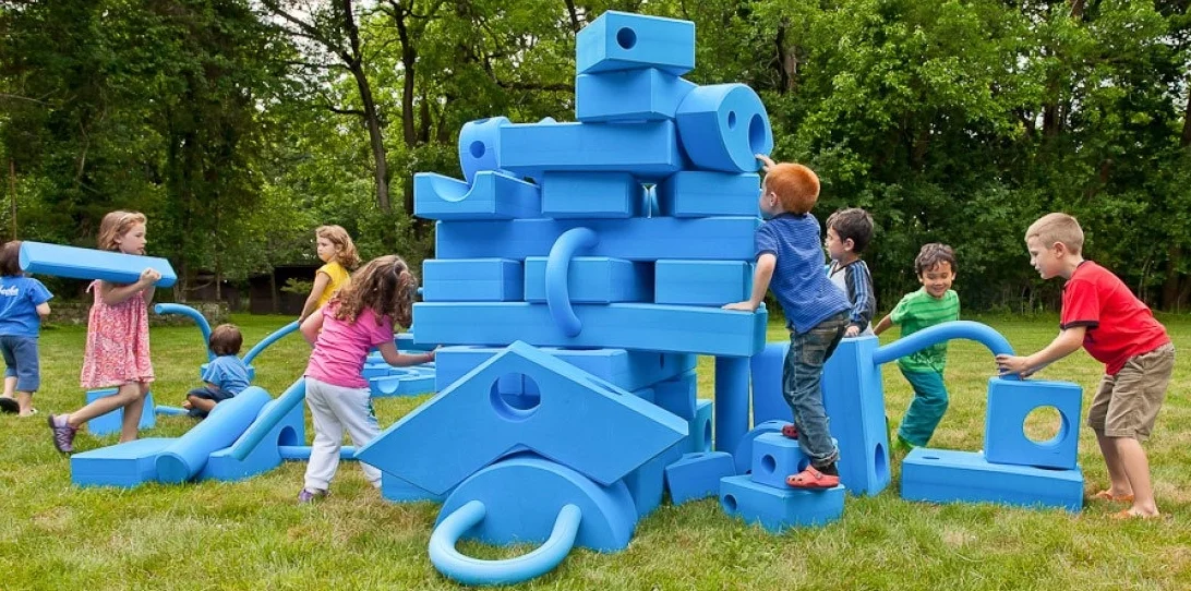 According to industrial designer Tucker Viemeister, "Unit blocks are ergonomically perfect, and there is a natural evolution to how kids interact with blocks that happens without forcing or guiding." Viemeister was with the Rockwell Group when David Rockwell developed the Imagination Playground, a set of blocks inspired by Froebel, Montessori, and Pratt that goes further by allowing children to create their own play space that, as noted in Imagination Playground’s mission statement, “combines all of the benefits of block play on a larger-than-life-size scale.” The blocks are easily separated and packed into a box, antiquating the notion of the traditional, fixed playground. Imagination Playground represents a seismic moment in contemporary block design, in that it is based on existing pedagogy but offers a new benefit, the ability for children to build something they can physically interact with at a much greater scale. The blocks offer children a new challenge in the calculated risk of designing something to support their weight. Imagination Playground blocks have been a success, perhaps because, as Viemeister says, “They mesh exactly with the industrial design philosophy of learning by making.”