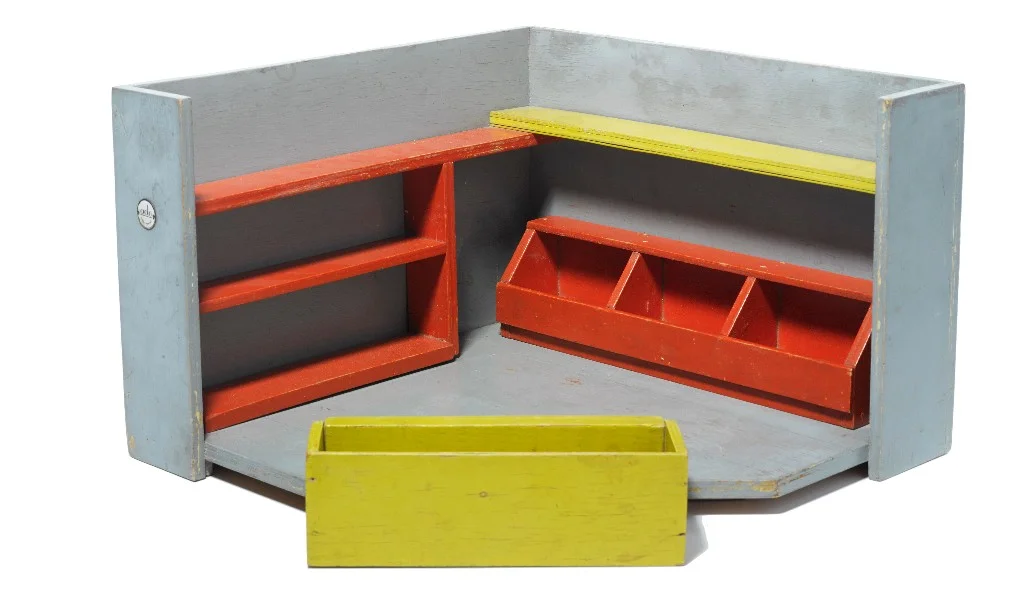 Verzuu immersed himself in the artistic and educational ideas of the modernist avant-garde, often testing his designs on his eleven children. Branded with its now-characteristic trademark, each ADO toy became increasingly bold in design, with bright colors and abstract shapes reflecting Verzuu’s knowledge of the Bauhaus and de Stijl ideologies, along with the influence of Dutch architects and furniture designers Gerrit Rietveld and Henrik Wouda. This simplified visual vocabulary was underpinned by a nuanced argument on the artistic and educational merit of toys. “The shape should not be a miniature copy of the original, of which the young child’s mind does not understand the many details and which forms a dead end for the imagination,” Verzuu stated in a 1934–35 ADO toy vehicle catalog; “quite the reverse—the shape, with a lack of elaboration and well-chosen proportions should serve to show the essence of an object.” A firm believer in the power of aesthetic activity to shape everyday life, Verzuu was drawn to the work of educational theorist Maria Montessori, and became a prominent voice in burgeoning discussions on the ability of toys to educate a child in art appreciation. ADO toys were intended to feed children’s imaginations and inform them about the beauty of life.